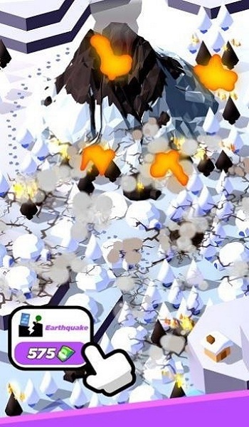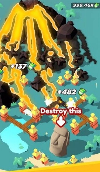 3、看岩浆摧毁建筑赚钱,右下角显示当前金币数,数字会不断增加。